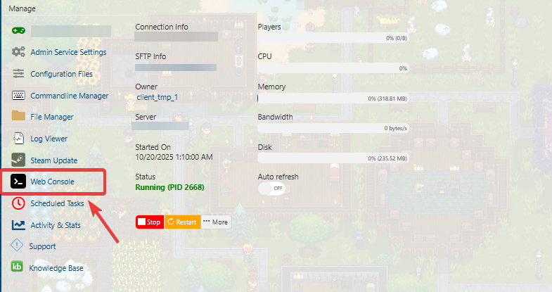 3. Select the Web Console in your game panel.